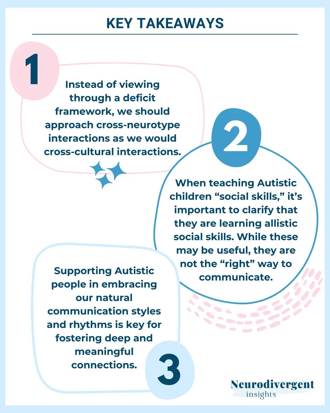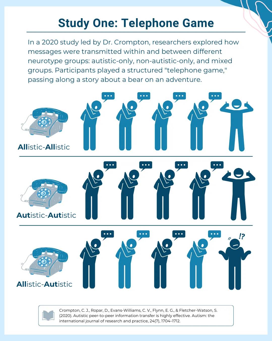 My favorite part of it is the reference to a study done looking at communication between three groups: all Autistic folks, all Allistic (not Autistic) folks and a mixed group. "The results were telling: In groups of only one neurotype–either only Autistic individuals or only non-Autistic individuals–the story tended to remain relatively intact for a longer period. However, in the mixed neurotype groups, the story fell apart much more quickly, becoming significantly altered or even unintelligible by the time it reached the final participant. This rapid breakdown in mixed groups highlighted the unique challenges in cross-neurotype communication."